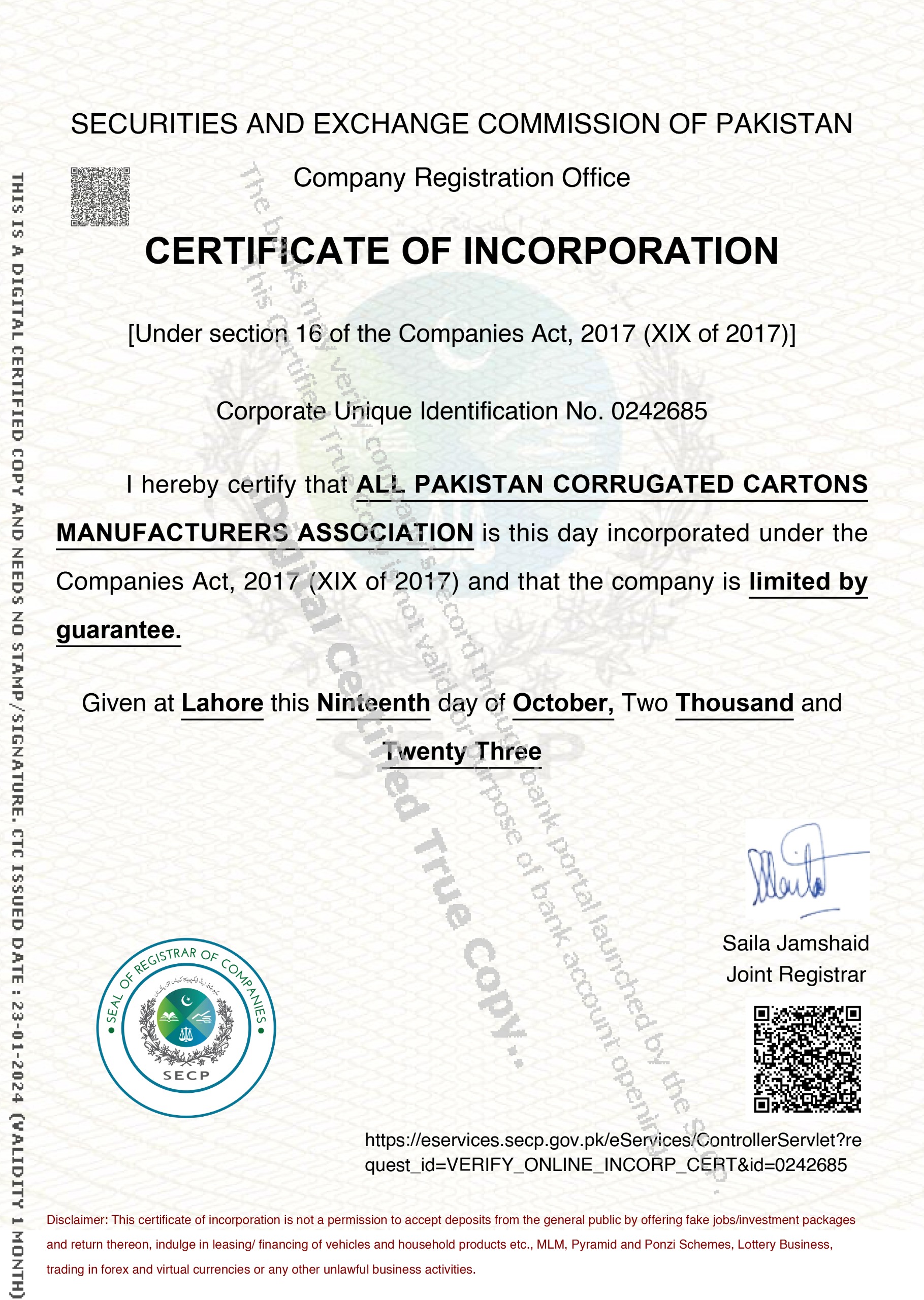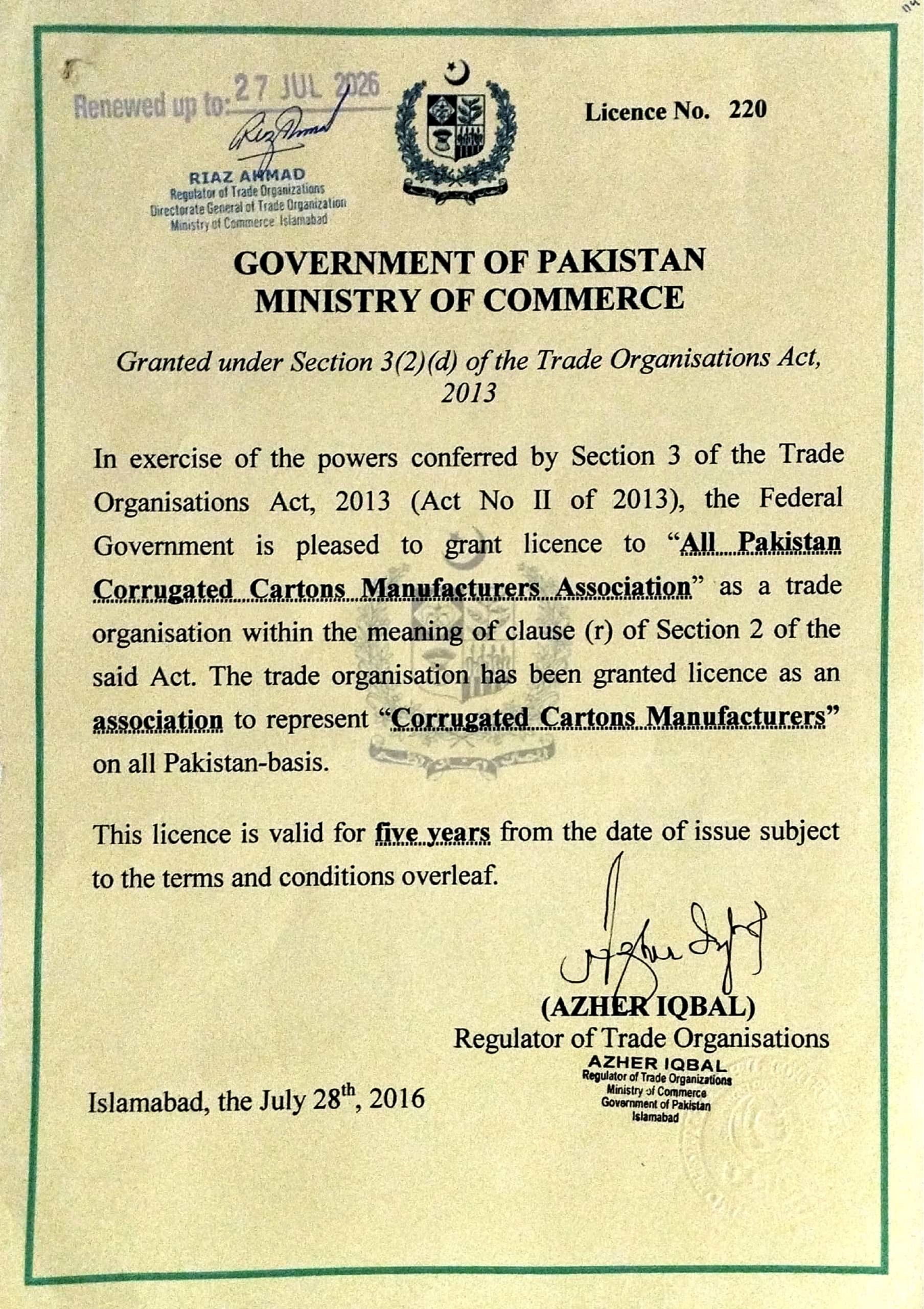 FPCCI Certificate APCCMA Licence M&AOA of all Pakistan Corrugated Cartons Manufacturers Association.